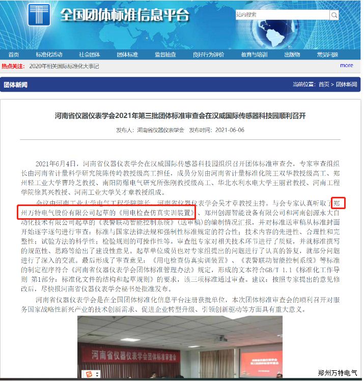 近日,由萬特電氣制定的河南省儀器儀表學(xué)會團(tuán)體標(biāo)準(zhǔn)《用電檢查仿真實(shí)訓(xùn)裝置》T/HIS 006,于2021年6月11日發(fā)布,將于2021年7月10日實(shí)施。