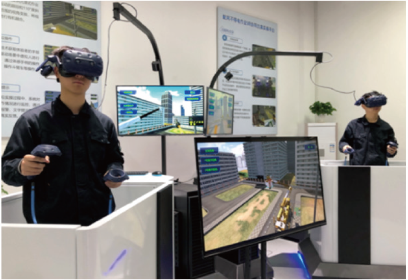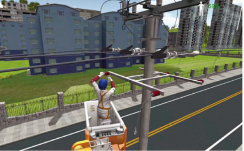 配網(wǎng)帶電作業(yè)VR 實訓(xùn)系統(tǒng)采用VR 多人互動技術(shù)和仿真絕緣斗臂車平臺相結(jié)合的方式,為參訓(xùn)人員提供沉浸式 的作業(yè)環(huán)境。培訓(xùn)人員按各自崗位在虛擬環(huán)境中,扮演不同的作業(yè)人員模擬開展帶電作業(yè),真實感受作業(yè)工 況和操作職責(zé),在違章時通過畫面、聲音、文字、觸覺感知等形式給予實時的反饋與警示,系統(tǒng)在確保人身 安全的前提下進(jìn)行高仿真的虛擬培訓(xùn),能夠有效提升學(xué)員的應(yīng)變能力和實操技能。