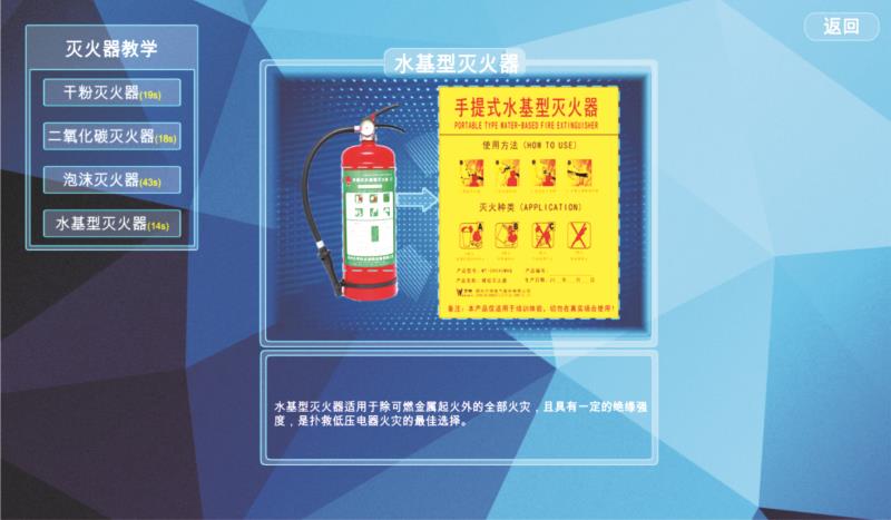 虛擬滅火體驗實訓(xùn)系統(tǒng)采用公司自主研發(fā)的動作識別系統(tǒng),3D 虛擬現(xiàn)實、無線通信等多種先進(jìn) 技術(shù)手段。該系統(tǒng)分為消防教學(xué)、模擬演練、隱患排查三大部分。虛擬滅火體驗實訓(xùn)系統(tǒng)配置 多種檢測、評測模塊,通過對滅火器狀態(tài)的數(shù)據(jù)采集實現(xiàn)整個滅火流程的測評,達(dá)到自動檢 測、自動判斷、自動評分的效果。